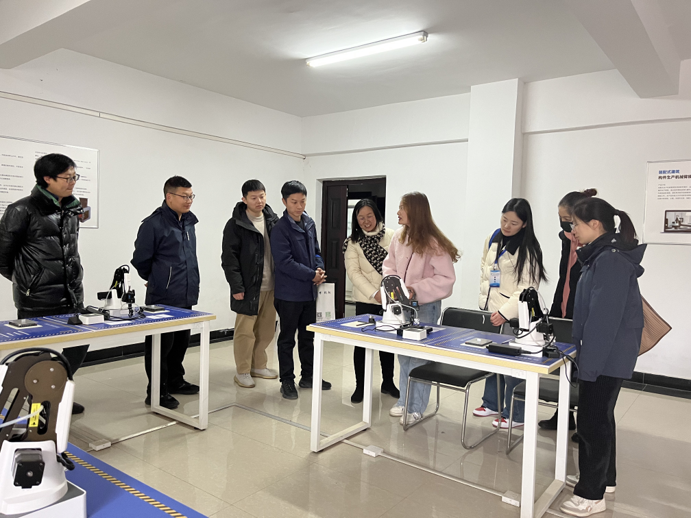 本次调研旨在了解省内双高A档建筑院校在装配式实训基地以及其他实训建设方面的先进做法,为我院实训建设提供新的思路和方向。湖北建院建筑管理学院副院长顾娟、建设工程管理专业负责人刘红霞老师对建工学院进行了热情接待,并就专业发展进行了交流。装配式实训基地责任教师郭如意老师带领大家参观基地,并详细介绍了该校装配式实训基地建设情况,包括装配式建筑全装修工法样板间、预制构建生产工艺流程设备及沙盘模型、装配式1+X证书考核项目装置等设施。