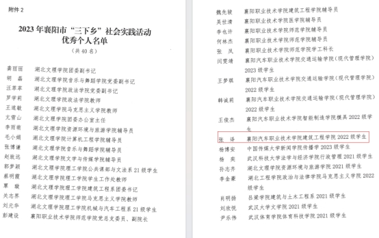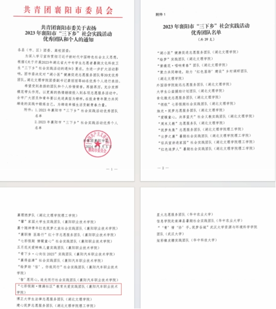 近日,共青团襄阳市委关于表彰2023年襄阳市“三下乡”社会实践活动优秀团队和个人的获奖名单公布,我院“七彩假期·情满社区”教育关爱实践团队获得市级优秀团队,团队成员张译获得“三下乡”优秀个人。