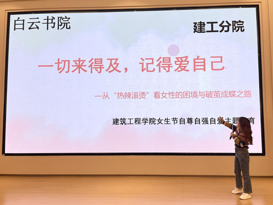 三月春来,阳光渐暖,伴随着春天的脚步,女生节如期而至。为了进一步促进女大学生的发展,建设和谐校园,2024年3月7日建筑工程学院邀请心理社会专家彭晶为建筑工程学院全体女生带来了以“一切来得急,记得爱自己”为主题的自尊自强自爱女生节讲座。
