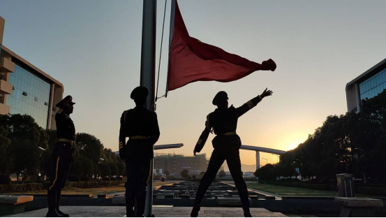 秋风送爽,雨后初霁。6时50分,升旗仪式正式开始,国旗护卫队身着戎装,昂首挺胸,迈着整齐而坚定的步伐,护送鲜艳的五星红旗至升旗台。宏伟的国歌奏响,五星红旗冉冉升起。全体师生庄严肃立,行注目礼,高声齐唱国歌,歌声整齐嘹亮,心中充满激情。