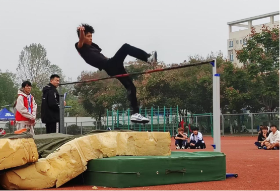跳高赛场上,.运动员跃起时,身姿笔挺、动作流畅,展现出了完美的跳高技巧,运动员们向着更高、更远的目标发起冲锋。