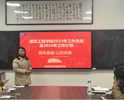 会议第一项议程,建工学院院长何红霞,回顾了学院在招生就业、教学改革、党建工作、技能培养、内涵建设、教师培养、产教融合、订单培养、学管工作、社会服务等十个方面取得的优异成绩以及学院去年取得的各项标志性成果,并对2024的工作目标进行了详细部署,她要求全体教职工在新的一年坚持问题导向,目标导向,对标对表查漏补缺,抓好标志性成果。