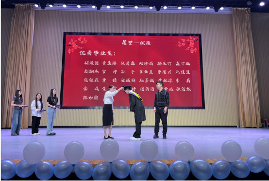 拨穗仪式中。何院长为毕业生代表拨穗,李书记为毕业生们颁发毕业证书,"穗"动青春,成熟如穗,这一拨寓意着建工学子们稻穗成熟、硕果累累、同时也代表了老师对他们破茧成蝶的期许。随后,毕业生代表向班主任献花致谢,以鲜花传递对师长培育的感恩。
