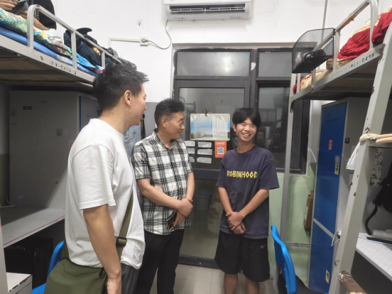 走访中,包校长与同学们从新学期课程准备聊到日常作息安排,从饮食安全叮嘱到身心健康关怀,语气温和如春日暖阳,让初返校园的同学们倍感亲切。智能建造学院的领导老师们也同步了解着同学们的生活需求,细致记录下大家提出的建议,用务实行动为学子们筑牢校园“温暖港湾”。在1C416宿舍中,包校长与智能建造学院的周阳同学展开了一场格外暖心的对话。当问及暑假生活,周阳同学略带腼腆却眼神坚定地分享,为减轻家庭负担,他整个暑假都在实习,凭借自身本领完成项目任务:聊到未来规划,周阳更是条理清晰地提及,已制定好详细的学习计划,既要巩固专业核心课程,也要加强英语能力提升,希望通过努力进一步深造,在智能建造领域实现更高理想。包校长认真倾听着,不时点头赞许,对周阳同学自立自强的精神和清晰的人生规划给予高度肯定,鼓励该同学积极准备专升本,为美好明天奋斗。