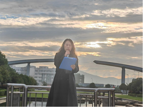 升旗礼毕,来自造价2502班的新生代表张乐萱同学做国旗下讲话。她表达了对大学生活的美好憧憬和坚定决心,号召全体新同学尽快适应新环境,恪守校训,勤勉学习,用汗水浇灌梦想,为学校的发展贡献青春力量。