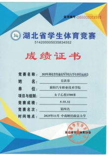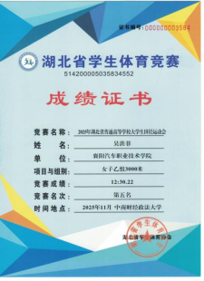 吴洪菲,女,智能建造学院工程技术2501班学生。在湖北省大学生田径运动会上,她以坚韧的意志与出色的实力,在女子1500米与3000米项目中双双斩获佳绩,分别夺得第四名与第五名,用汗水与步伐在赛道上书写了新时代女大学生的拼搏篇章,为学校赢得了荣誉。
